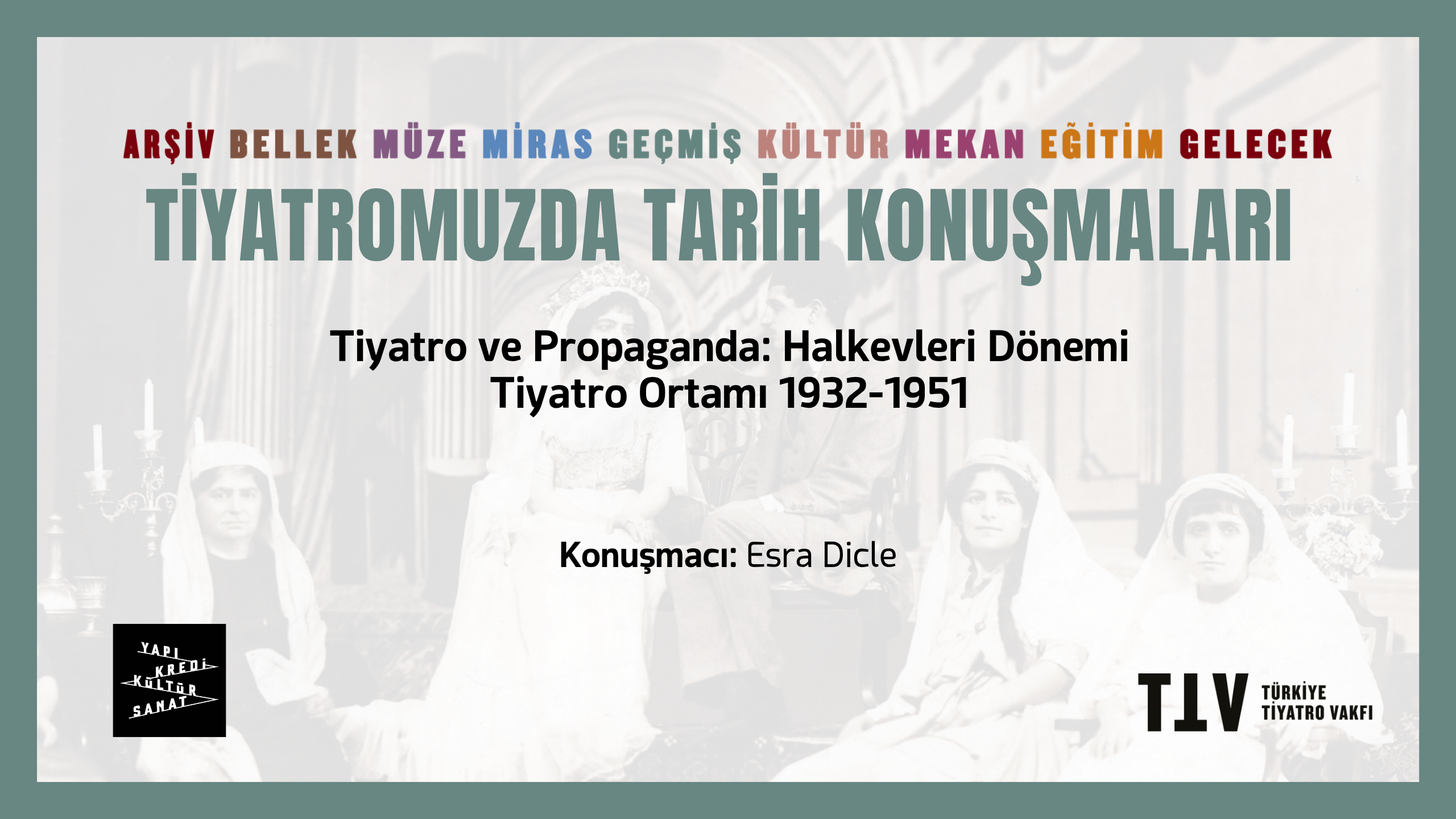 Tiyatromuzda Tarih Konuşmaları dizisinin XXVII. oturumu Esra Dicle’nin “Tiyatro ve Propaganda: Halkevleri Dönemi Tiyatro Ortamı 1932-1951″ başlıklı konuşmasıyla 13 Mayıs Salı günü Yapı Kredi Kültür Sanat Loca salonunda gerçekleştirildi. Türkiye Cumhuriyeti’nin kurulmasından sonra Kemalist modernleşmenin en önemli amacı, Batı normlarına dayalı yeni bir Türk kimliği inşa etmekti. Bu süreçte, müzik, resim, mimari, heykel ve tiyatro gibi alanlar, ulusal kimlik ve bilinç aşılamak için etkili araçlar hâline geldi. Modern ulus-devlet bu alanlardaki faaliyetleri, Cumhuriyet Halk Partisi (CHP) ile ekonomik, bürokratik ve idari ilişkileri olan Halkevleri bünyesinde merkezileştirdi. Özellikle 1932 ile 1944 yılları arasında Halkevleri’nde devletin ihtiyaçlarına uygun yeni bir yurttaş tipini oluşturmak amacıyla yazdırılmış 100’ün üzerinde oyun sahnelendi. Ancak Halkevleri’nin bu yoğun ve merkezî faaliyetlerine rağmen modern ulus-devletin ilkeleriyle çeşitli alanlarda-nedenlerle çatışmalar yaşayan Yakup Kadri, Nâzım Hikmet, Necip Fazıl, Fatma Nudiye, Nezihe Muhittin ve Halide Edip gibi yazarlar da tiyatro aracılığıyla eleştirilerini dile getirdiler. Bu bağlamda Esra Dicle konuşmasında tek parti dönemindeki tiyatro polikaları Halkevleri faaliyetleri odağında ele alınırken, sayılan isimler çerçevesinde de karşıt-muhalif söylem ve estetiklerle oluşturulan tiyatronun niteliklerine yakından bakarak tek parti döneminin tiyatro ortamının estetik-politik dinamikleri ve gerilimleri tartışmaya açtı.