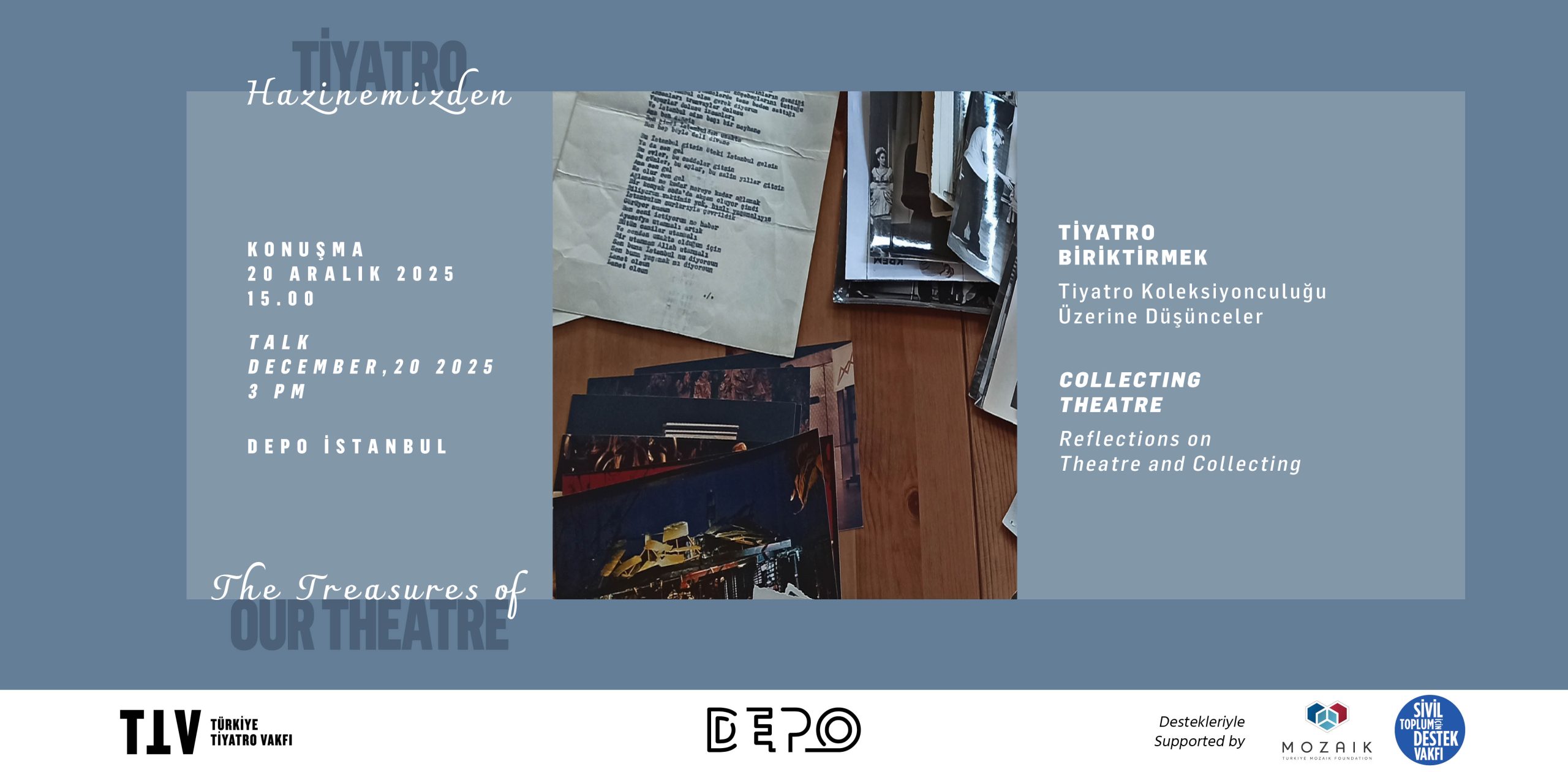 Tiyatro Hazinemizden sergisi kapsamında, 20 Aralık Cumartesi günü saat 15.00’te Depo İstanbul’da Tiyatroyu Biriktirmek adlı bir söyleşi gerçekleştirdik.
